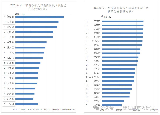 據(jù)數(shù)據(jù)測算,五一全國旅游人均消費維持在565.73元。2024年五一期間旅游人均消費省排名中,浙江、云南、遼寧、吉林、新疆排名前五;市排名中,寧波、南京、大連、青島、長沙絕對值排名前五。