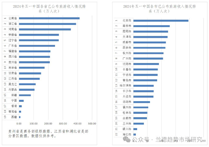 引入增長統(tǒng)計的原因在于,旅游絕對值數(shù)據(jù)受經(jīng)濟、人口、地域面積、旅游資源分配等影響,即便統(tǒng)計結(jié)果準確也不能反映當?shù)芈糜伟l(fā)展速度,增長統(tǒng)計結(jié)果在一定程度上能夠看出當?shù)禺斈昊蛘弋斊谠诼糜谓?jīng)濟發(fā)展上所做的努力。增長率統(tǒng)計主要采用的是2024年五一和2023年五一同比數(shù)據(jù)。